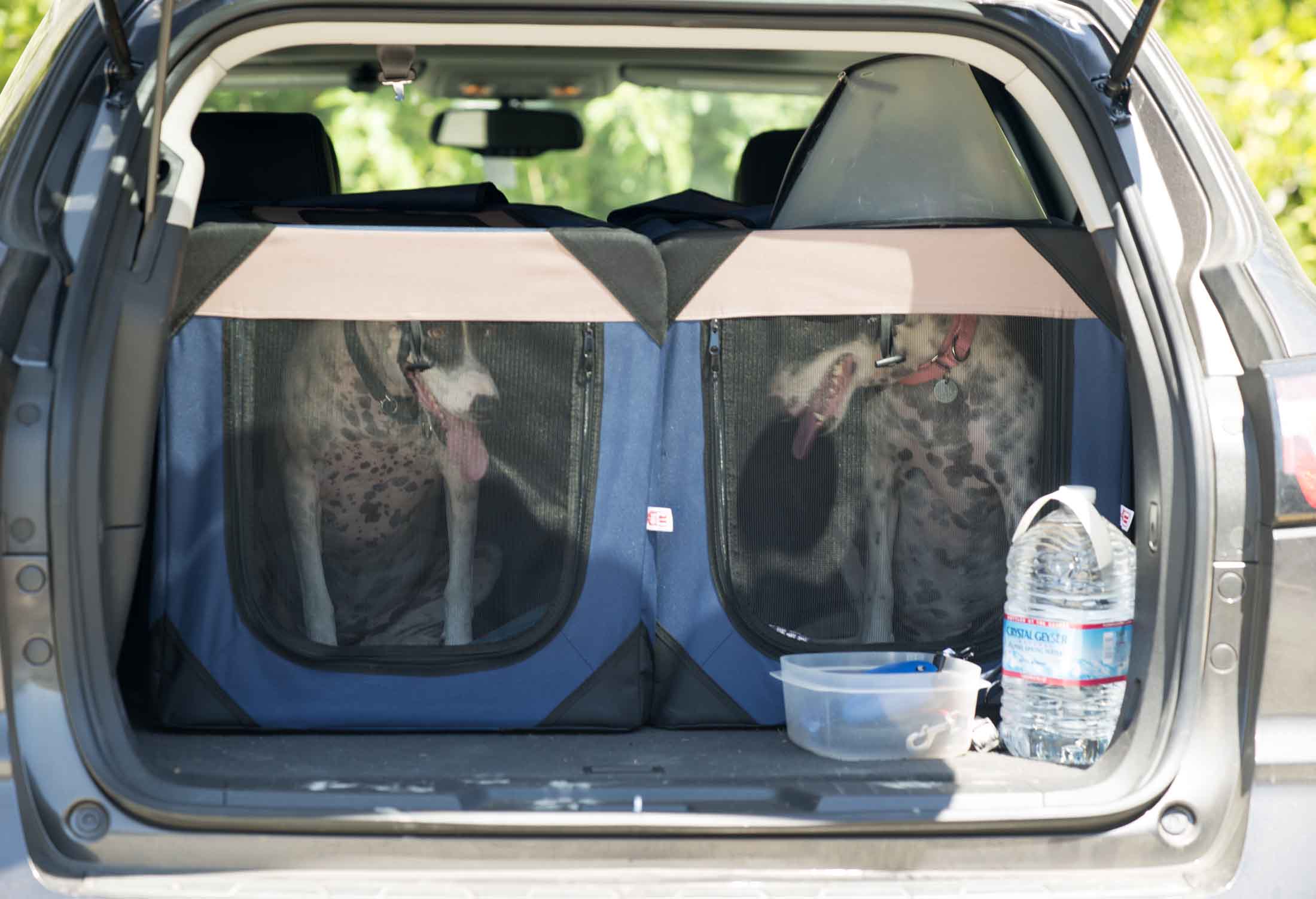 With notes in hand and the paperwork complete, Meg gently lifted each dog into new travel crates, side-by-side, with a window between them so the girls could see each other. In each crate were new toys and color-coded leashes and collars.