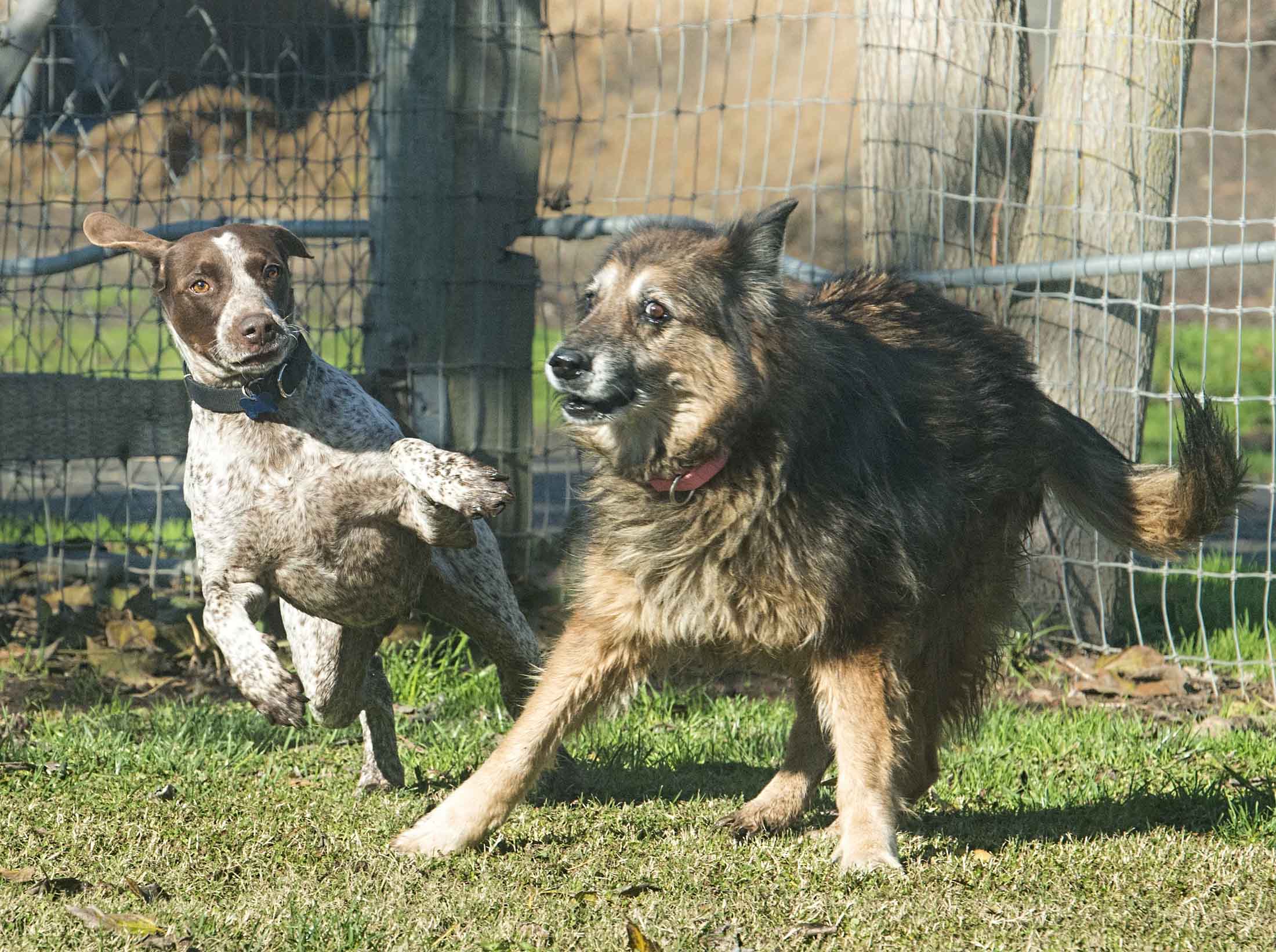 Hiding in the adjacent yard so he wouldn’t see me, I watched and listened, hopeful, as Gage chased the girls around the Park. The family had a vacation planned and could not take him immediately. We crossed our paws, and they returned last week with their dog, Toby, for an introduction. Toby is a big Pointer mix without a care in the world. His boundless energy put Gage a little on guard. We sent them home for a trial week to make sure all would be well. And after a few days of figuring each other out – it was.