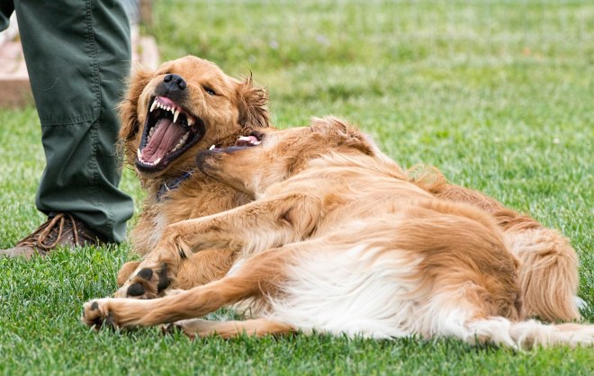 We gained confidence in differentiating between a dog βdiscussionβ and a potential problem, and when and how to intervene with low, calm tones, body language, appropriate tools, and tactics when trouble does arise. (All this snarling and gnashing of teeth was in good play as you can see from the photo progression.)