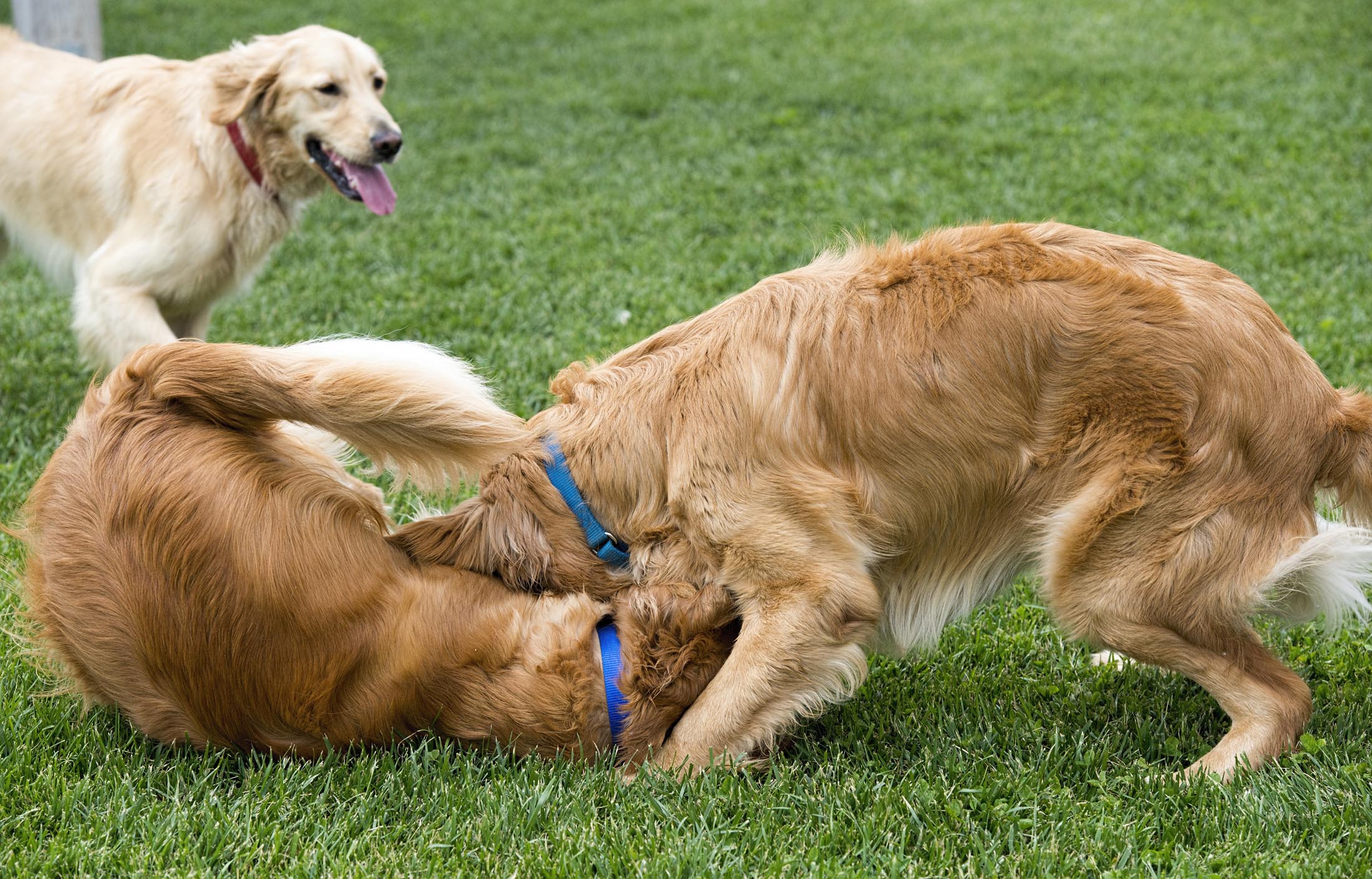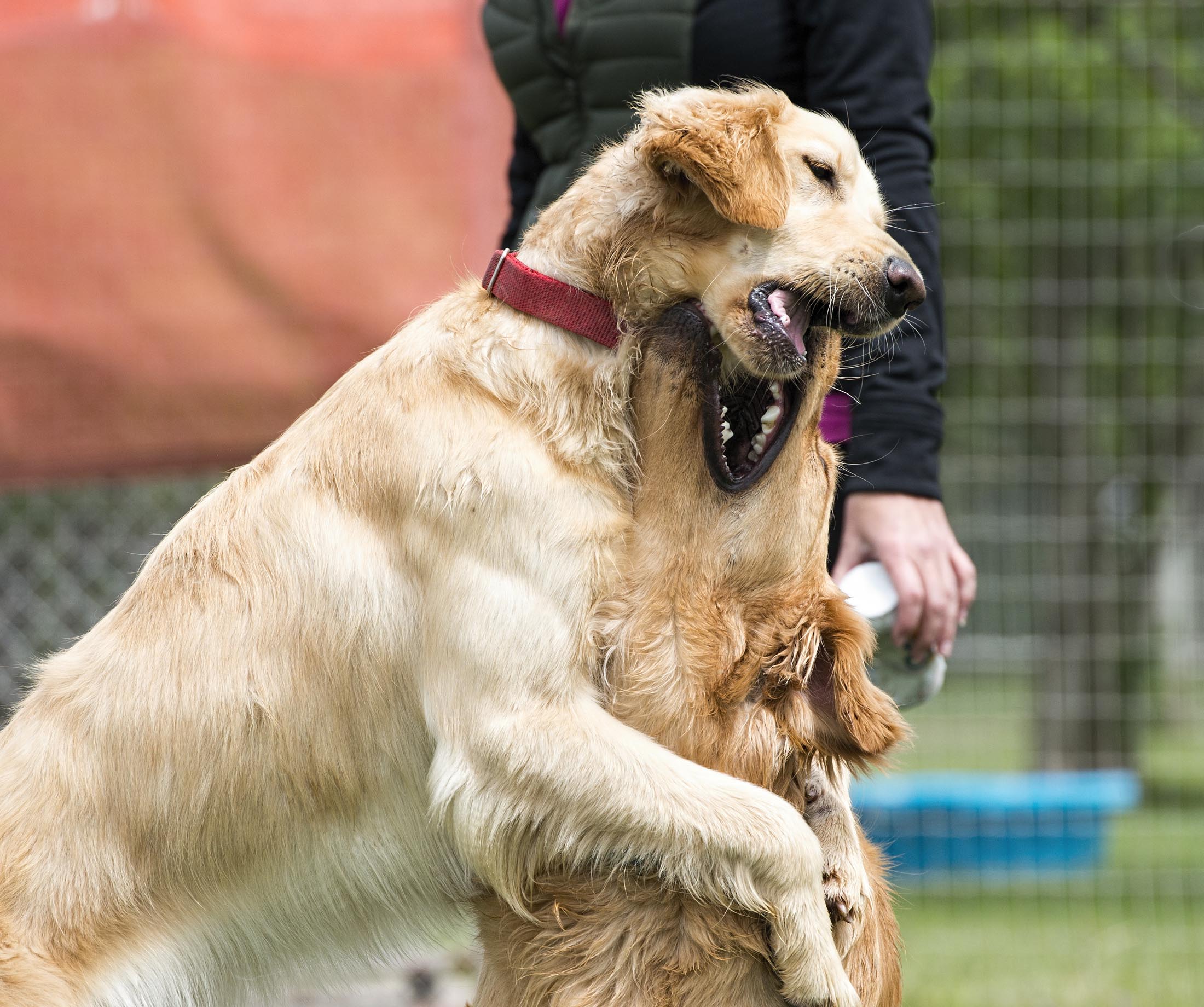 We gained confidence in differentiating between a dog βdiscussionβ and a potential problem, and when and how to intervene with low, calm tones, body language, appropriate tools, and tactics when trouble does arise. (All this snarling and gnashing of teeth was in good play as you can see from the photo progression.)