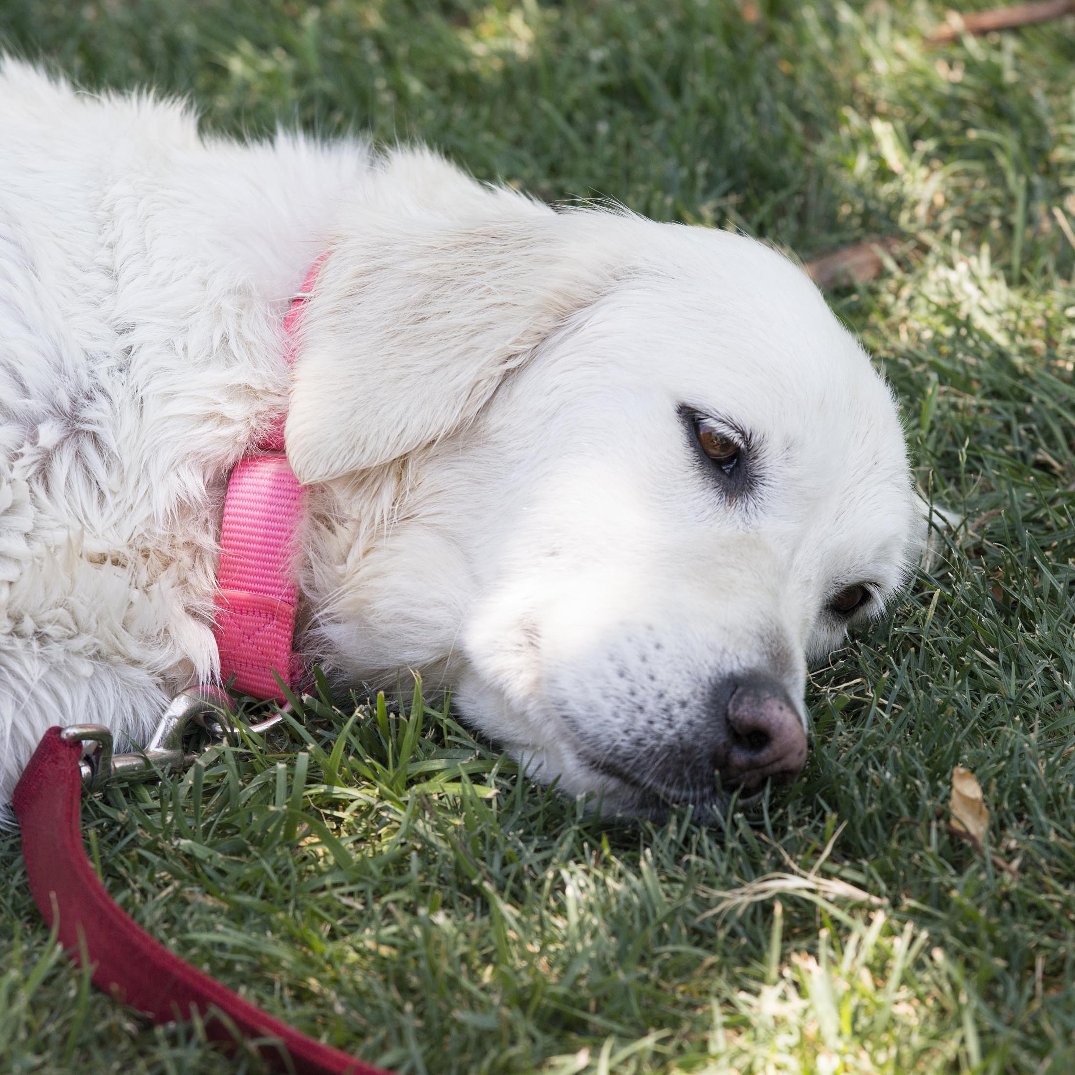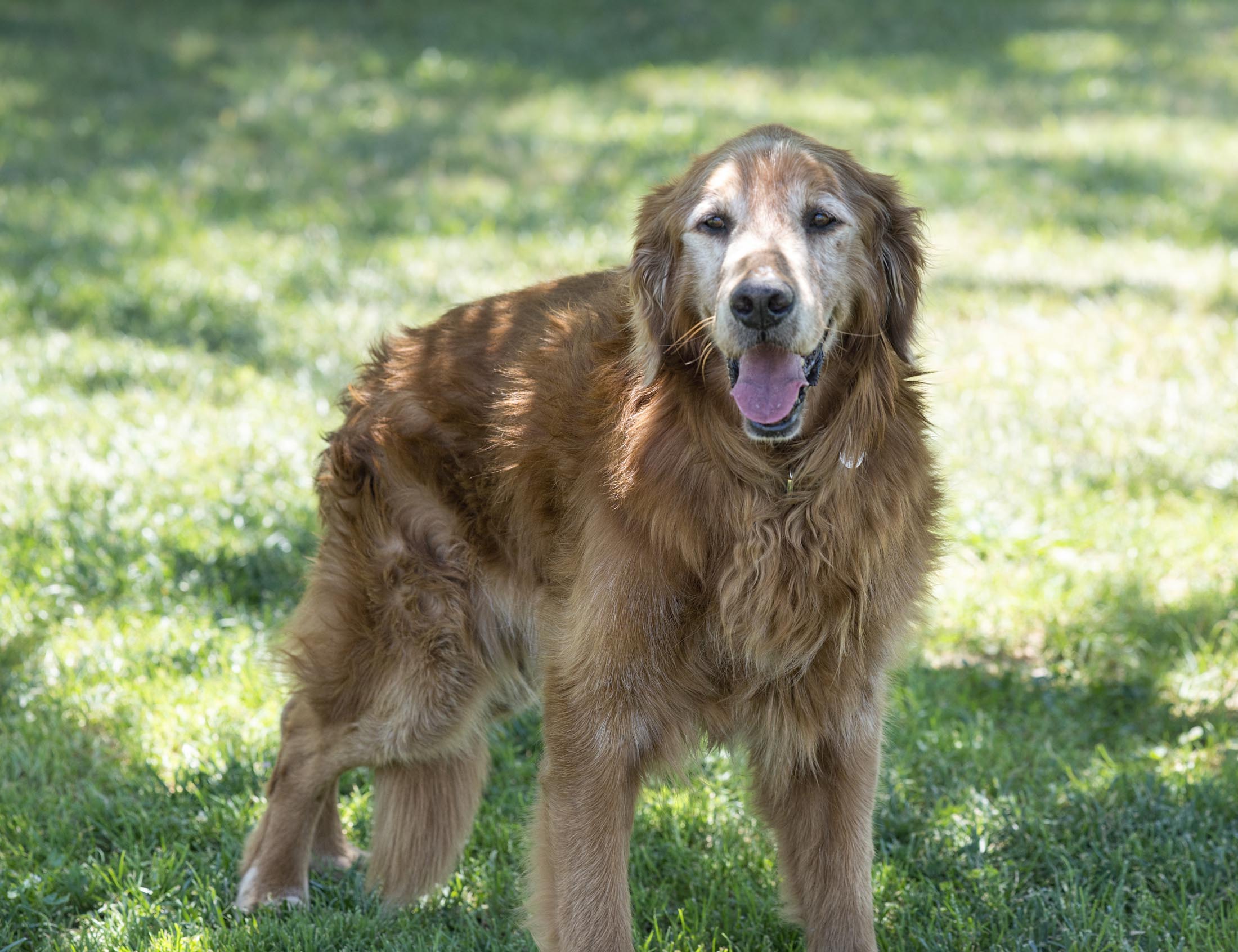 Desta was a stray found gorging on cat food left outdoors. A Good Samaritan captured and brought the clearly emaciated “puppy” to Homeward Bound’s vet. The “puppy” turned out to be a one-year-old, growth-stunted Golden who had clearly had an encounter with something unfriendly – most likely of the moving vehicle type.