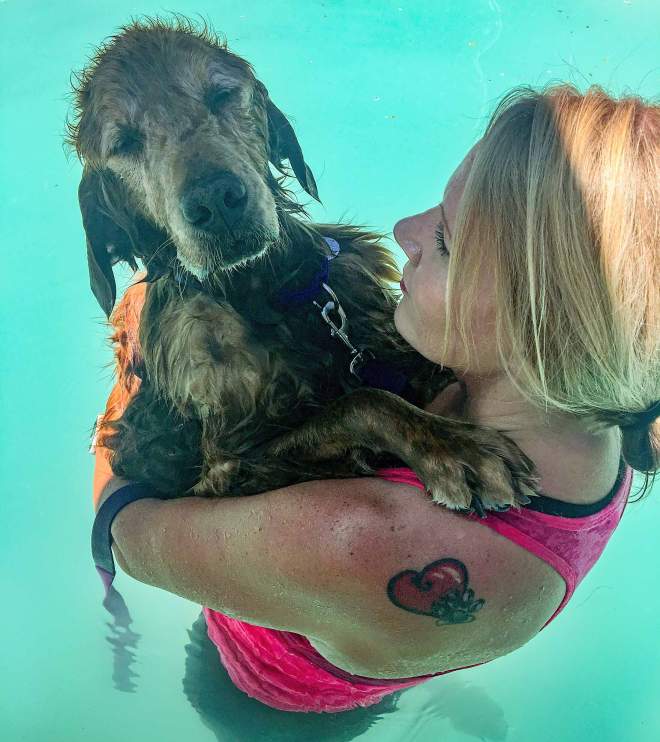 Lori has been out daily to get him in the pool in hopes of strengthening those back legs. Now, he only gets this “assistance” when she has put him through the paces.